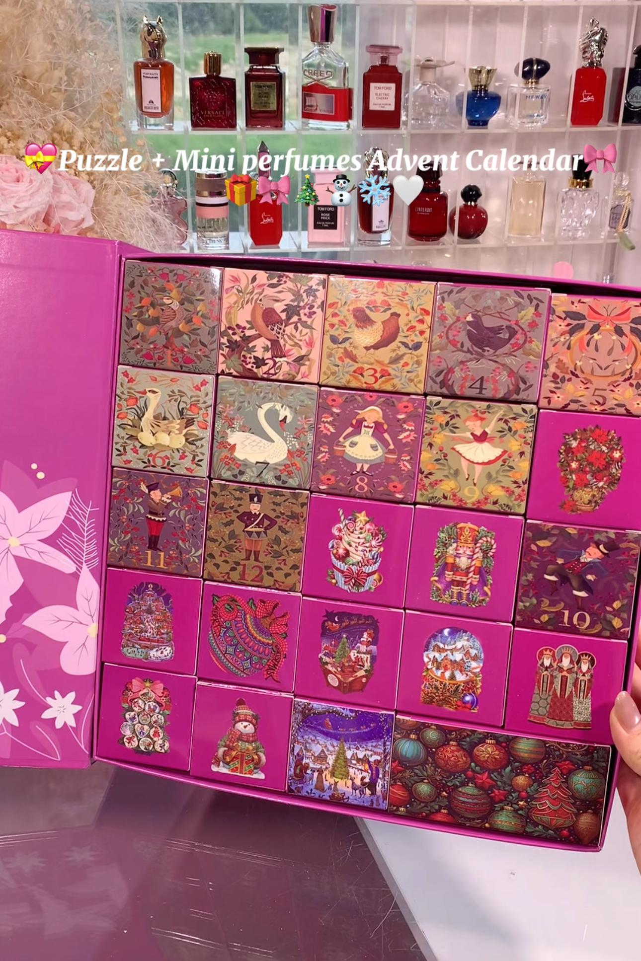 Each puzzle gift set contains a jigsaw puzzle and 24 miniature perfume bottles. with the perfumes randomly included.